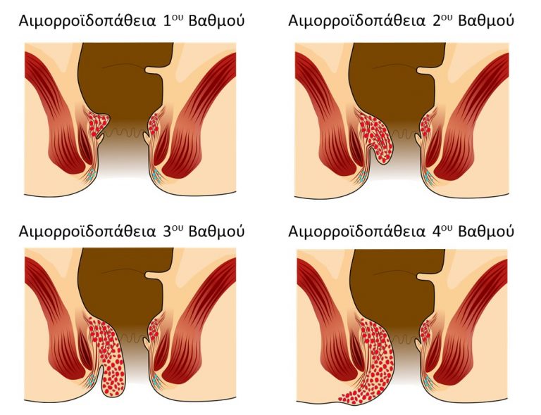 Οι εσωτερικές αιμορροΐδες χωρίζονται σε 4 βαθμούς ανάλογα με το βαθμό πρόπτωσής τους: